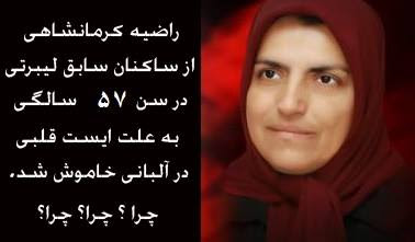 خشمگینم...غمگینم و سرشار از فریادی که وجودم را تلخ کرده است... نمیتوانم حالم را توصیف کنم.در مرگ مظلومانه بچه هایی که تک به تک خاموش میشوند. راضیه کرمانشاهی به علت ایست قلبی در سن ۵۷ سالگی در بیمارستانی در آلبانی درگذشت! فکر میکردیم این تعداد اندک بچه هایی که از لیبرتی و عراق جنگ زده بیرون آمده اند، حداقل جانشان نجات یافته است. اما انبوه بیماری های جسمی و روحی ناشی از بودن بیست و اندی سال در عراق، دست به گریبان بودن با انواع فشارها ومحدودیت های درمانی، بهداشتی در فضای جنگ نفس گیر بیرونی...جنگی که هیچ ربطی به آنها ندارد...هر لحظه منتظر حمله و خمپاره و موشکباران بودن در زندانی که در آن گرفتار آمده اند... همچنین نشست های طولانی و فشارهای روحی مداوم درونی در جهت گزارش نوشتن از خود که مبادا کسی دچار زندگی طلبی!! یعنی جدا شدن از مجاهدین!! گردد. گویا رمقشان را گرفته و مرگ در همه جا در کمین آنها نشسته است! .. مرگ در کمین تک تک بچه های لیبرتی.. همان یاران قدیمی ما نشسته است.